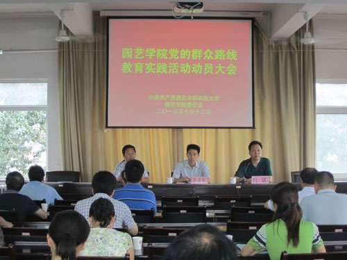 7月12日上午,园艺学院党的群众路线教育实践活动动员大会在学院蔬菜所四层会议室召开,学校第二督导组副组长赵武军同志,联络员李生梅同志、学院领导班子全体成员、党委委员、教授、引进人才代表、党外人士代表、党支部书记、系主任、科级以上干部,党员代表和教职工代表58人参加了会议。园艺学院院长、党委委员、学院教育实践活动领导小组副组长马锋旺同志主持动员会。