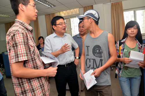校党委书记梁桂与前来学生社区办公室办事的新生交谈